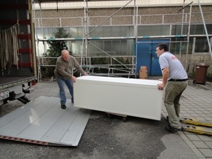 Das Technikbecken ist schon verladen, jetzt der Unterschrank für den Keller