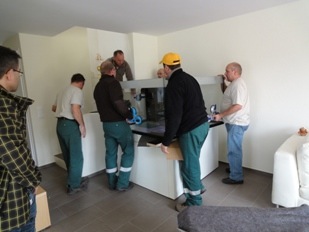 Um 9 Uhr treffe ich dann in Frauenfeld bei der Transportfirma Rieser+Vetter ein. Wir fahren mit einem 3.5 Tönner nach Konstanz und verladen die beiden Becken und Unterschränke. Der Verlad geht einfach über die Bühne und wir trinken bei Pascal noch einen Kaffee. Der Transporteur lässt sich beraten wie das Becken auf den Unterschrank gestellt werden soll. Wir sollen erst auf mit Teppichen geschützte Leisten stellen um es dann Seite für Seite auf den Unterschrank zu stellen. Falls das Becken direkt auf den Unterschrank gestellt wird, riskieren wir, dass auf einer Seite die Kiesblende abgeschert wird.