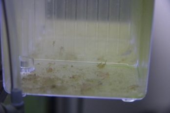 Ich gebe den Zuchtansatz in ein altes Plastikaquarium und behalte einen kleinen Rest im Kühlschrank für den Fall dass mir die Zucht zusammenbricht. Ich verdünne mit Leitungswasser im Verhältnis von 1:2 und stelle das Becken neben das Artemienbecken: Erstens bekommt das Phytoplankton so Licht vom Artemiabecken und zweitens soll den Artemien beim Anblick von Phytoplankton das Wasser in den Mandibeln zusammenlaufen.