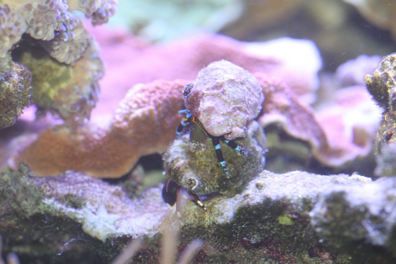 Nach einer etwa ständigen Anpassung an mein Wasser im Keller, während ich im Regen meine neuen Laufschuhe ausprobiere, setze ich Norman behutsam von Hand auf die Acropora. Der Pseudochromis Flavivertex kommt gleich angeschwommen um den Neuankömmling freudig zu begrüssen... Der gelb/blaue Fisch ist so begeistert dass er den kleinen Wüstenfuchs sogar küssen will... Irgendwie scheint er sich nicht damit anzufreunden, dass er einen Untermieter bekommen hat und greift Norman nun immer wieder an. Norman wetzt seine Krallen und hebt mutig seine Scheren in die Luft! "Bravo, Normi, zeig's dem Kerl und zwick' ihn ordentlich in die Nase!", rufe ich ihm aufmunternd zu. Er wehrt sich standhaft, ein richtiger Stormin' Norman halt! Plötzlich ist Norman im freien Wasser und eine seiner Scheren fällt zu Boden! Verdammt, Saddam hat ihn mit seinem goldenen Revolver erwischt! Glücklicherweise ist Saddam ein mieser Feldherr und so folgt nicht sofort ein zweiter Angriff auf's Normans ungeschütztes Hinterteil. Der verletzte Normi kann sich unter einen schützenden Felsen zurückziehen. Er scheint okay zu sein und fechtet weiter mit seiner einzelnen Schere. Pseudochromis-Saddam scheint erst mal beruhigt zu sein und zieht sich auf's Oberdeck zurück um eine Siegeszigarre zu rauchen. Armer Norman, man kann nicht immer gewinnen im Leben, aber deine Schere wird dir sicher rasch wieder nachwachsen und die Zeit heilt alle Wunden oder lässt dich wenigstens die Schmerzen vergessen!