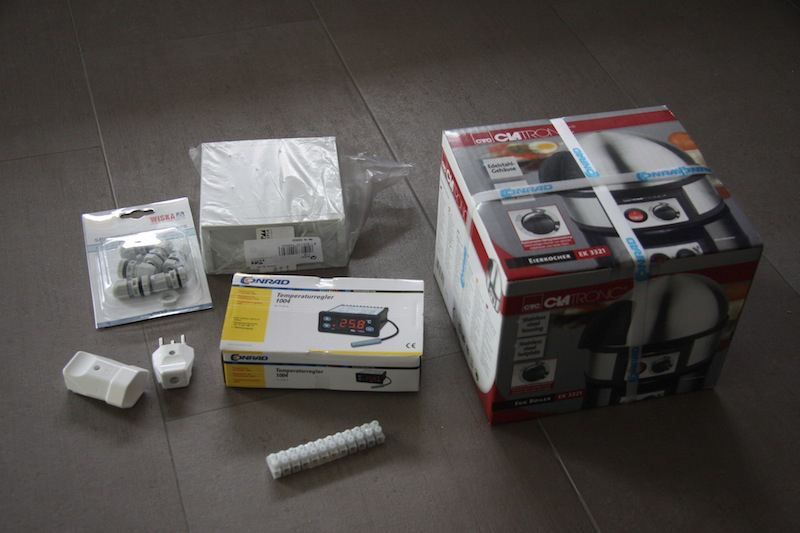Die Kunst an der Sache ist es die Temperatur von 64.2 Grad Celsius so genau wie möglich über eine längere Zeitdauer zu halten. Heutzutage geht das microprozessorgesteuert mit Digitalanzeige, einem sogenannten PID-Controller. Leider ist bei Conrad in Dietlikon derzeit nur ein einziger PID-Controller an Lager. Dieser schaltet aber nur 3A, das heisst unsere Last darf höchstens 3Ax230V=700Watt Leistung ziehen. Die Idee aus dem Galileo-Clip mit der Plastikbox und den Tauchsiedern finde ich verbesserungsfähig, warum nicht einfach einen Wasserkocher nehmen? Bei Conrad gibt es diverse Wasserkocher, allerdings ziehen diese in der Regel 2400 Watt oder auch die ganz kleinen Reiseteekocher Immer noch 1000 Watt. Dann landen wir bei den Eierkochern: Wir könnten doch auch einen Eierkocher nehmen und diesen mittels PID-Controller bei erreichen der 64.2 Grad ausschalten. Wir kaufen also einen Eierkocher, den PID-Controller, ein Gehäuse, Stecker und Buchse, Lüsterklemmen und Kabeldurchführungen.