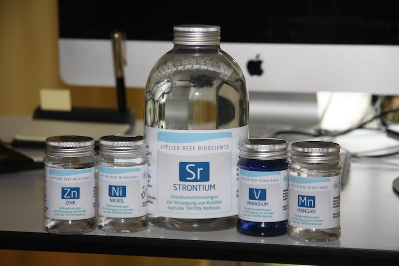 Obschon die letzte Triton-Wasseranalyse ergeben hat, dass meine Wasserwerte gut sind, ist doch das Bessere der Feind des Guten. Bei denjenigen Elemente, wo sich langsam ein Mangel abzeichnet, werde ich diese durch gezielte Zugaben ergänzen. Da die Trace Base ziemlich ins Geld gehen können, die kleinen Fläschchen kosten 23 CHF, die grossen 30 CHF, entschliesse ich erst einmal nur Strontium, Zink, Nickel, Vanadium und Mangan zuzugeben. Von Bor habe ich noch einen einen Rest von einer früheren Zugabe.