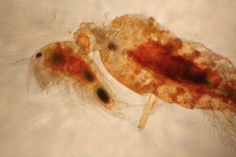 Das Paar im Dunkelfeld: Der grüne Darminhalt des Kleinen ist gut zu sehen: Er hat sich wohl den Bauch mit Phytoplankton vollgeschlagen
