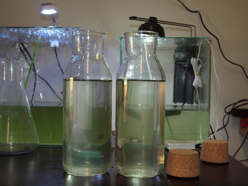 Die grösste Schwierigkeit bei der Planktonzucht ist es, reine Kulturen hinzubekommen. Mit meinen offenen Zuchtgefässen aus IKEA Bladet-Vasen klappt das definitiv nicht: Ich finde ein Gemisch von Tiggerpods und Brachionus im Zooplankton und dazu jede Menge Ciliaten und Euplotes im Bodensatz. In meinen Phytoplanktongefässen schwimmen wacker ausgewachsene Artemia und ebenfalls jede Menge Wimpertierchen. So lange die Photokultur nicht zusammenbricht, sind diese Schmarotzer nicht weiter schlimm, aber sauber ist das nicht. Das Prinzip soll sein, dass die Phytoplanktonzucht separiert von der Zooplanktonzucht abläuft und das Zooplankton gezielt mit Phytoplankton gefüttert wird. Eine Möglichkeit um Zooplankton in Photozuchten abzutöten ist es die Salinität massiv (bis zu 70 o/oo) zu erhöhen. Ich halte verschiedene Lösungen als Backups und für weitere Versuche auf dem Sims meines Kellerfensters. Aufgrund der Hangbauweise meines Hauses, verfüge ich über einen Kellervorraum mit Tageslicht und Aussicht auf die Füsse vorbeilaufender Postboten: Das ist natürlich für die Planktonzucht äusserst praktisch! Die verschiedenen Plastikkanister und Cocaflaschen auf dem Fenstersims haben sich in den letzten Wochen und Monaten etwas vermehrt und ich bin überzeugt meine italienische Putzfrau hält mich für einen der Drahtzieher des Thurgauer Ablegers der Ndrangheta, der auf seinem Fenstersims irgendwelches Drogenzeugs sonnenreifen lässt.