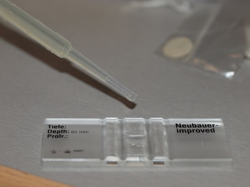 Das zu testende Medium, bei mir Phytoplanktonlösung, beim Onkel Doktor Blut, wird mittels Kapillareffekt automatisch in die Zählkammer gesaugt