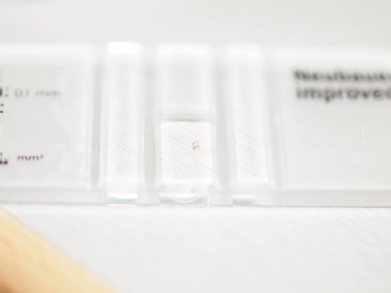 Wie fein muss allerdings dieses Sieb sein? Sogenanntes Maschen- oder Siebgewebe kann man im einschlägigen Handel in verschiedenen Feinheiten kaufen; aber welcher ist der richtige für meinen Zweck? Irgendwie muss ich rausfinden, wie gross die Sachen, welche ich unter dem Mikroskop betrachte, eigentlich sind. Im eBay finde ich etwas, das passend scheint und nicht allzuviel kostet: Eine Neubauer Zählkammer. Das Teil ist eigentlich dafür gedacht, dass Medizinische Praxisassistentinnen (aka Arztgehilfinnen) damit weisse und rote Blutkörperchen auszählen. Mit dieser Information kann der Arzt dann sagen, ob man sich tatsächlich an ranziger Guacamole den Magen verdorben hat oder man nur simuliert um die Fussball-WM zu gucken oder wahlweise sämtliche Harry Potter Bände in einem Zug durchzulesen. Ich bin mir nicht sicher, ob eine junge MPA des 21. Jahrhunderts dies noch mit einer Neubauer Zählkammer macht oder hierfür ein 100'000 Franken Analysegerät benutzt, aber in der Berufsschule wird dies sicher mal geübt oder zumindest demonstriert.