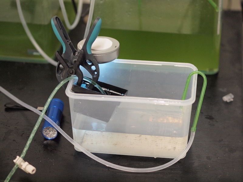Heute ist der grosse Ocellarisschlupf bei Voni geplant. Ich treffe etwa um 22 Uhr bei ihm ein, wir richten die Light Trap ein, verdunkeln das Zimmer und stellen die Strömung ab. Ich versuche ein paar Langzeitaufnahmen ab Stativ mit 30 bis 60 Sekunden Belichtungszeit. Dumm ist aber, dass ich ein Objektiv ohne manuelle Scharfeinstellung dabei habe und der eh schon schwache Autofokus meiner Olympus e-620 pumpt nur verzweifelt hin und her. Pünktlich 40 Minuten nach Lichterlöschen erkennen wir die ersten Larven im Schein der Light Trap. Da noch eine und noch eine, hier noch eine, bald wuseln sich immer zwischen 5 und 10 Larven im Schein der Larvenfalle. Die Larven steigen bis auf wenige Zentimeter unter das Loch der Larvenfalle, schwimmen auch rein aber dann auch rasch wieder hinaus. Voni meint, dass die Larven beim Durchqueren des Loches den Rand berühren, sich erschrecken und sich darum wieder fallen lassen. Wir experimentieren mit verschiedenen Leuchtstärken und stellen fest, dass dann am meisten Larven in die Falle schwimmen, wenn die LED-Leuchte mit mehreren Schichten Kreppband abgeklebt ist. Der Schein, der aus dem Loch tritt, soll nur ganz diffus sein um die besten Resultate zu erzielen. So eine Art Iris in der Falle vor der LED wäre natürlich ideal, aber konstruktiv wohl kaum umzusetzen. Wir erzielen einen deutlichen Fortschritt, wie wir die Falle einen Zentimeter tiefer eintauchen lassen: Vielleicht spüren ansonsten die Larven die Oberflächenspannung des Wassers und weichen zurück. Dies kann ich einfach ändern, deswegen machen wir diese Tests.