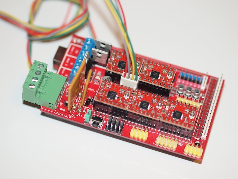 Auf dem Arduino ist eine Platine aufgesteckt: Hier eine RAMPS 1.4