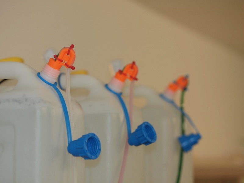 3 Artemia-Zuchtschalen für das Jugendfutter: Der rote Deckel markiert den frischesten Schlupf, der blaue Deckel den vorletzten Schlupf und kein Deckel heisst: frisch angesetzt